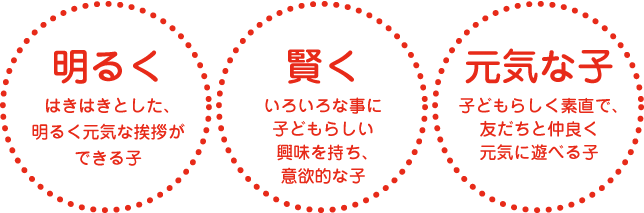 この世に生を受けてわずか数年。しかしこの幼児期こそは水が砂にしみこむようにどんどんまわりの環境を吸収して育ちます。「三つ子の魂百まで」のことわざ通り、人間性の基礎・基本をつくる大事な第一歩。いきいきとした子供たちはまさに次の時代の大切な人材となります。
